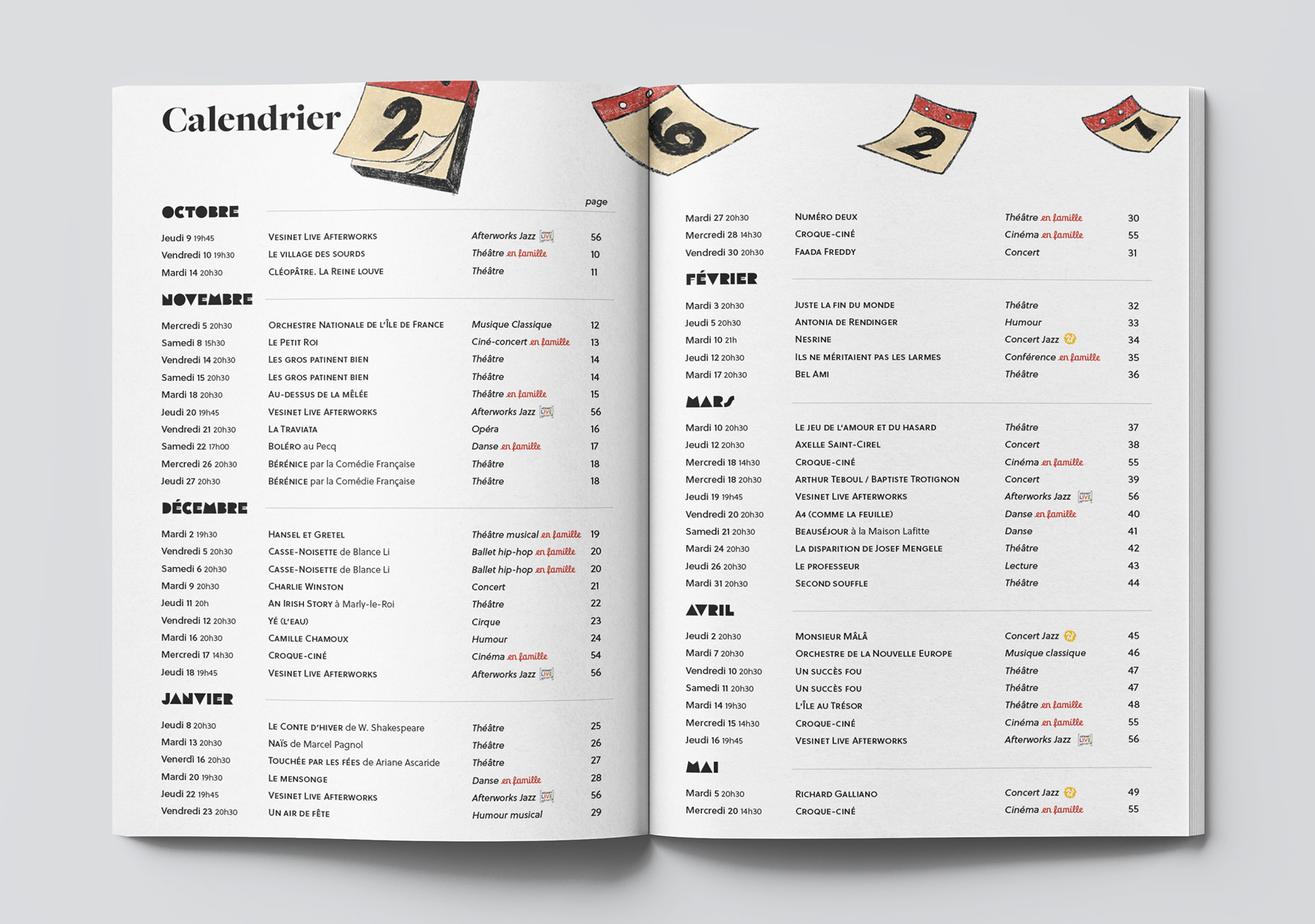 Season brochure for Théâtre du Vésinet. The project called for something playful and colorful. Illustrations and page layout by Giulia Barbini.