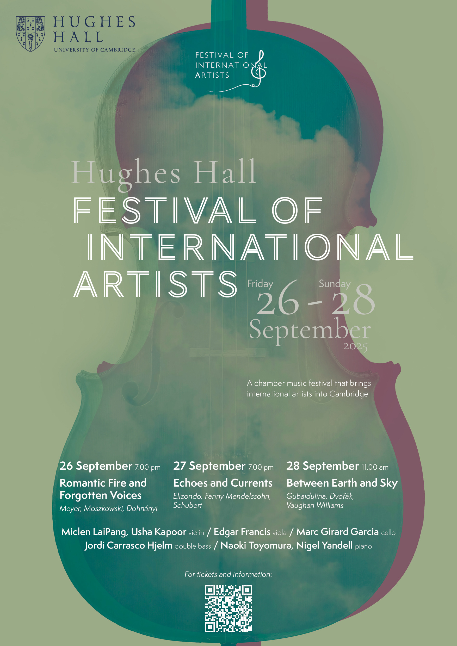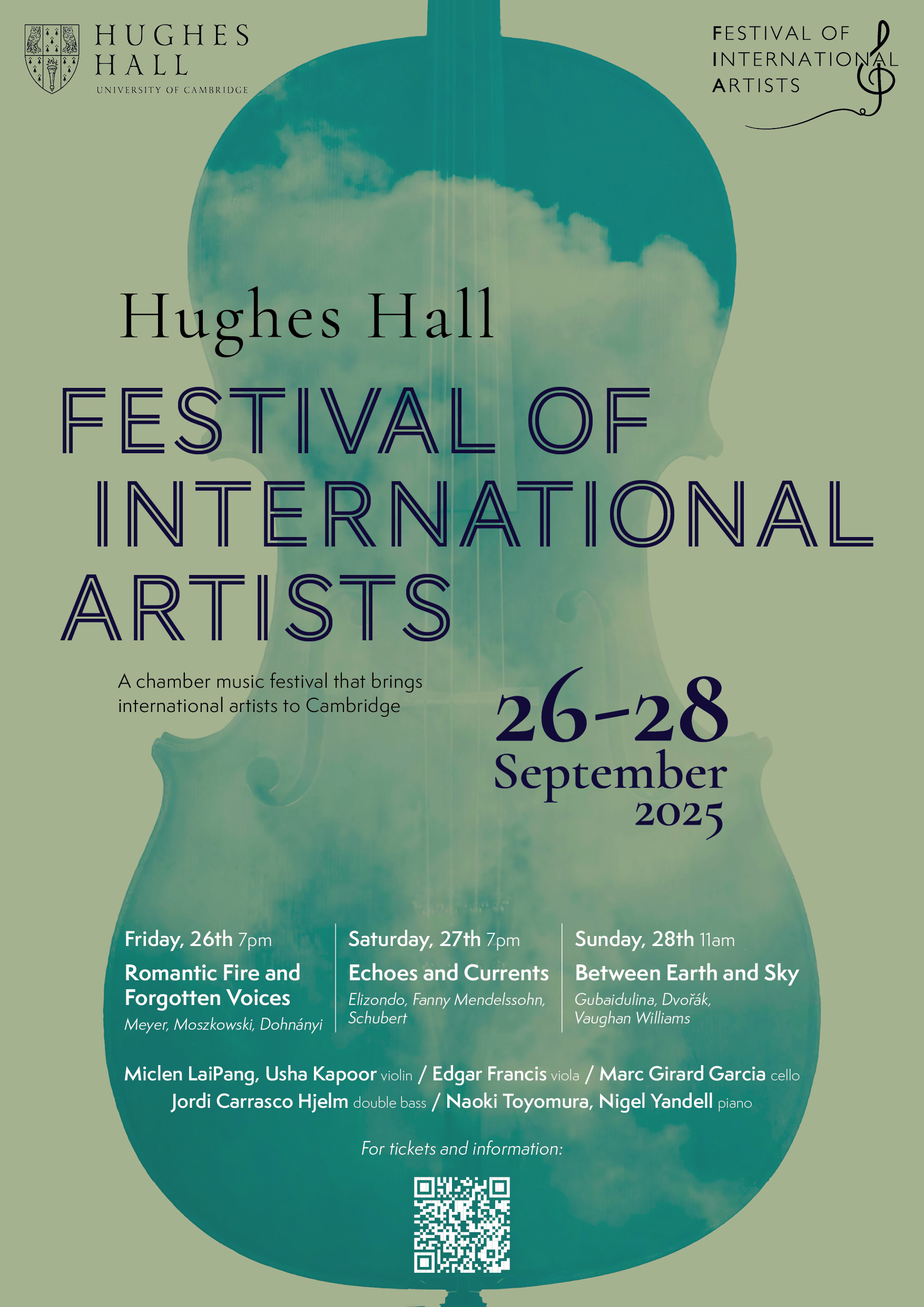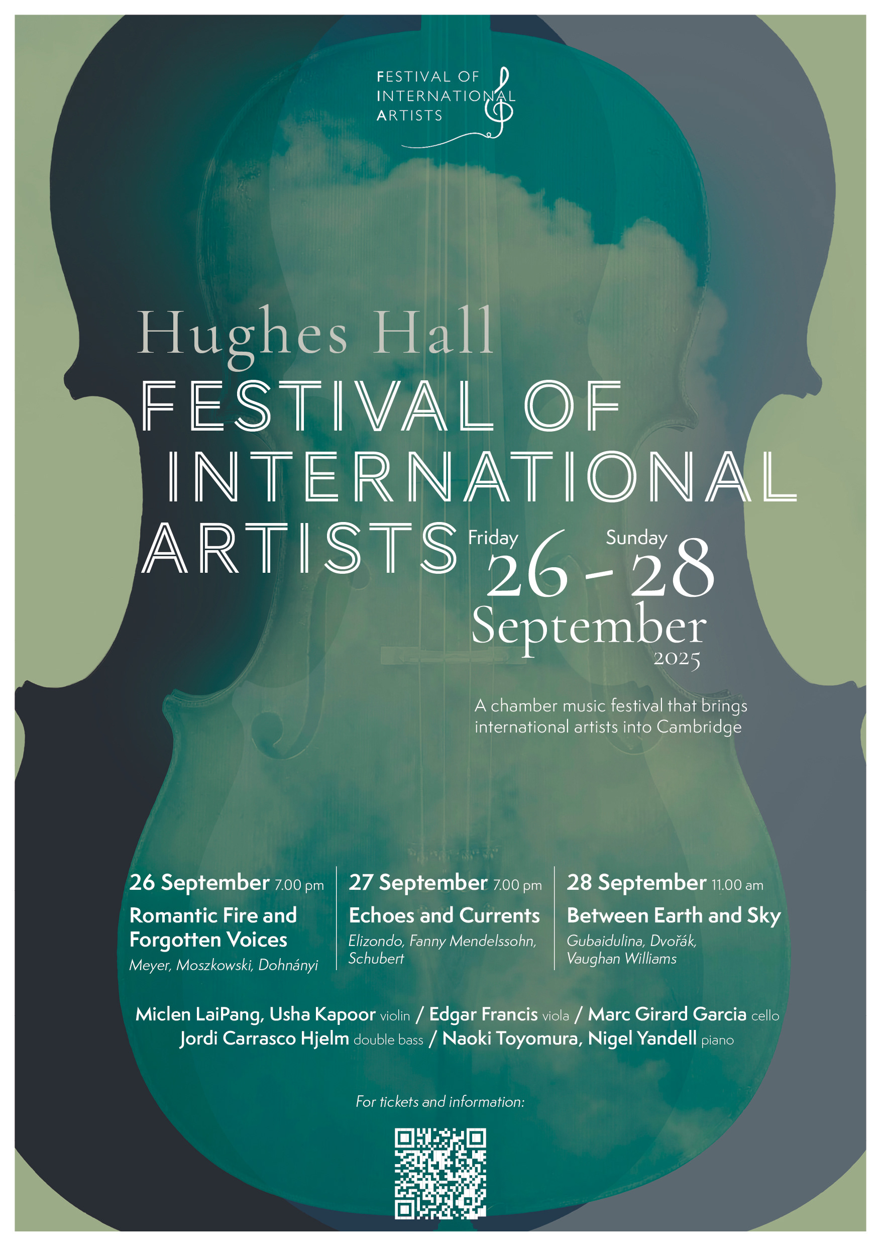 Poster for the Festival of International Artists Cambridge 2025. Here, the version chosen by the client; below, the other proposed versions. Image composition and graphic design by Giulia Barbini.